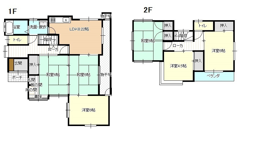 | 間取内訳 | 1F 8.2LDK / 6帖和×2 / 6洋 ・ 2F 6和 / 4.5洋 / 6洋 | ||||